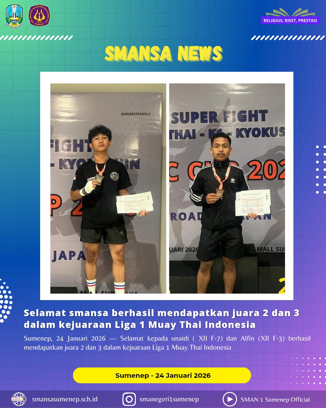 Alhamdulillah selamat dan sukses kepada Siswa atas nama Atas nama JUNAIDI : Xll F-7 ( Juara 3 ) dan ALFIN : Xll F-3 ( Juara 2) meraih juara di Kejurnas Liga 1 Muay Thai.