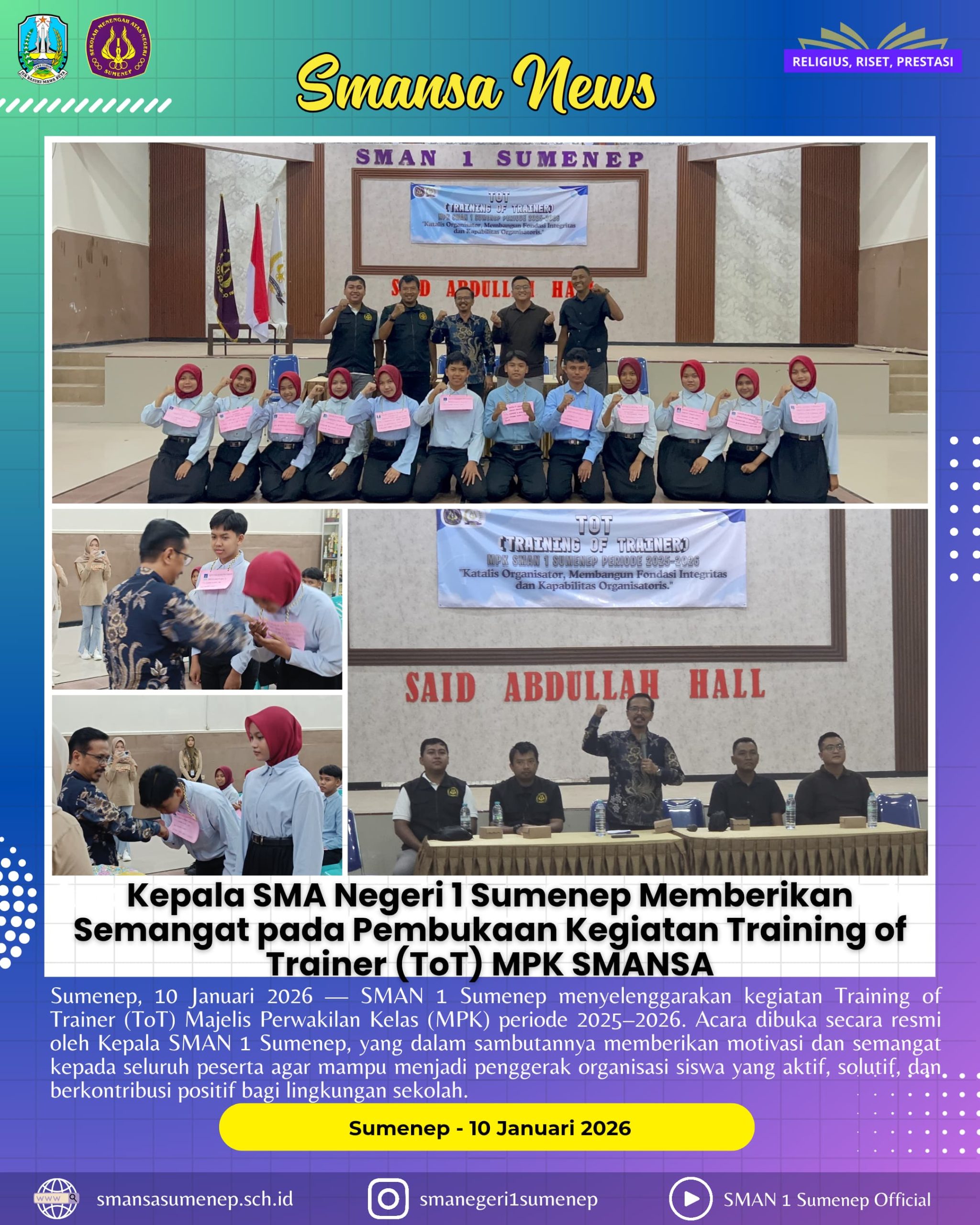 SMAN 1 Sumenep menyelenggarakan kegiatan Training of Trainer (ToT) Majelis Perwakilan Kelas (MPK) periode 2025-2026. Acara dibuka secara resmi oleh Kepala SMAN 1 Sumenep, yang dalam sambutannya memberikan motivasi dan semangat kepada seluruh peserta agar mampu menjadi penggerak organisasi Siswa yang aktif, solutif, dan berkontribusi positif bagi lingkungan sekolah.