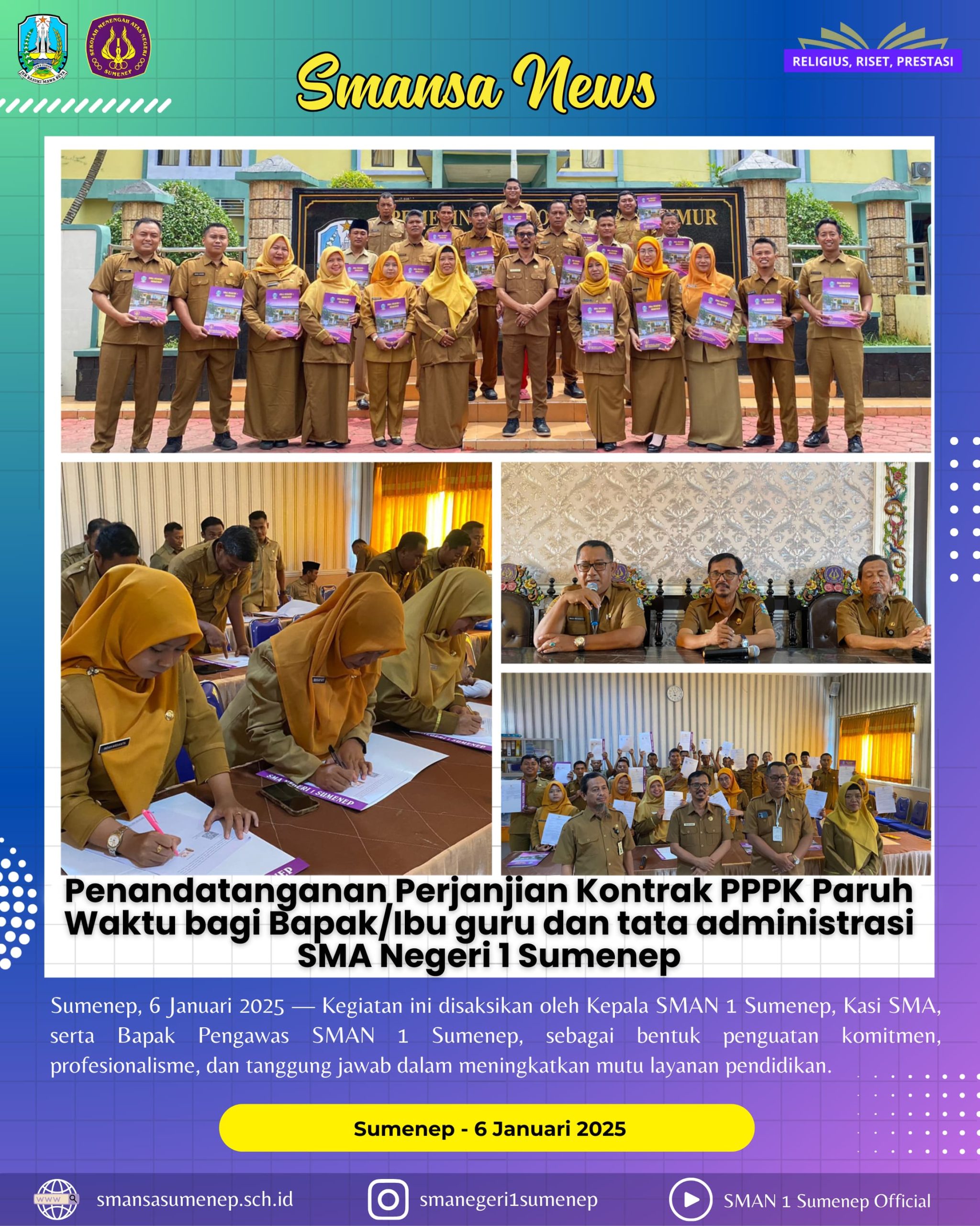 Penandatanganan dilakukan oleh Bapak/Ibu guru dan tata administrasi sekolah. Kegiatan ini disaksikan oleh Kepala SMAN 1 Sumenep, Kasi SMA serta Bapak Pengawas SMAN 1 Sumenep. Hal tersebut sebagai bentuk penguatan komitmen, profesionalisme, dan tanggung jawab dalam peningkatan mutu layanan pendidikan.