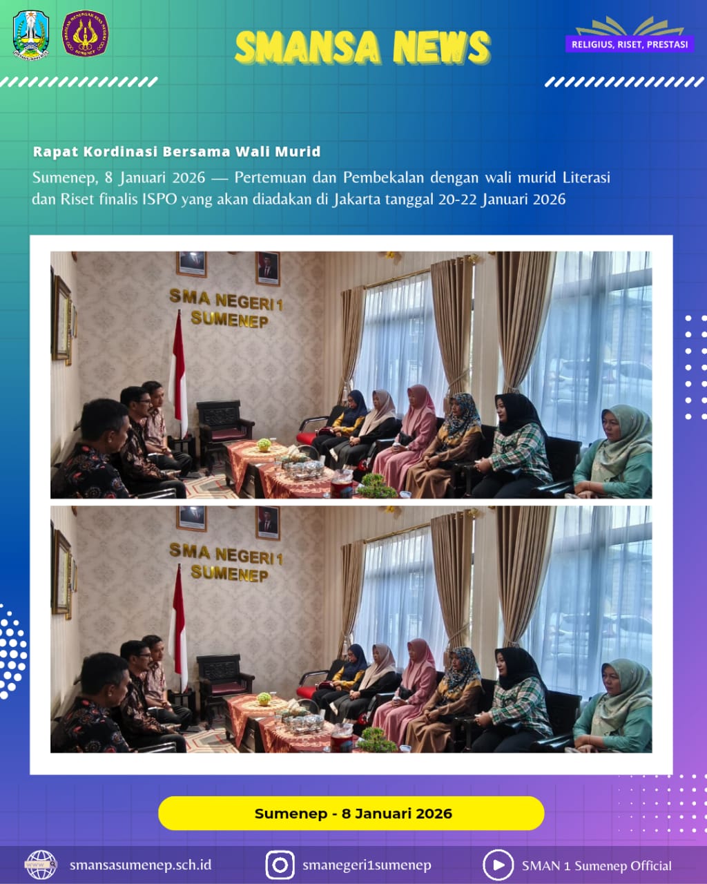Sumenep, 8 Januari 2026 – Pertemuan dan pembekalan dengan wali murid literasi dan riset finalis ISPO yang akan diadakan di Jakarta tanggal 20-22 Januari 2026.