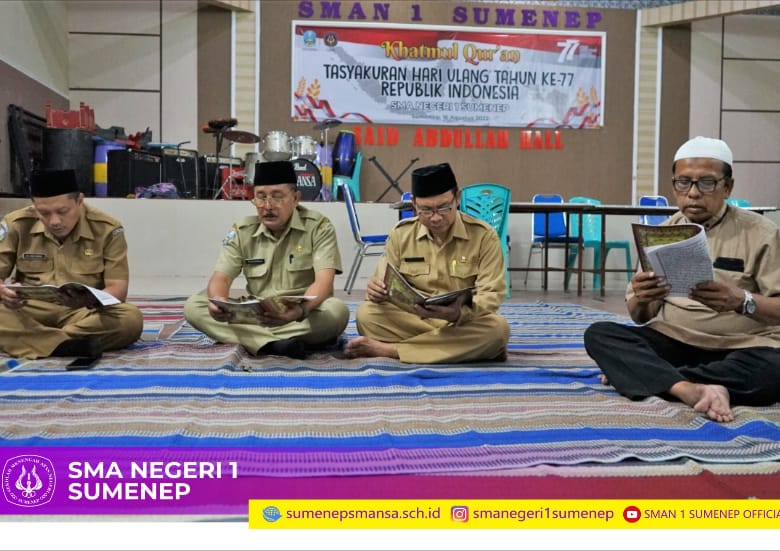 Memperingati Hari Ulang Tahun Kemerdekaan ke-77 Republik Indonesia, SMAN 1 Sumenep menggelar acara khusus dan berbeda dengan lainnya. Masih dalam rangkaian kegiatan PETTO BELLÂSÂN sebagai bentuk perayaan HUT RI tahun ini, SMAN 1 Sumenep menggelar acara Khataman Al-Qur’an dilanjutkan dengan Tumpengan. Acara dilaksanakan pada hari Selasa tanggal 16 Agustus 2022.