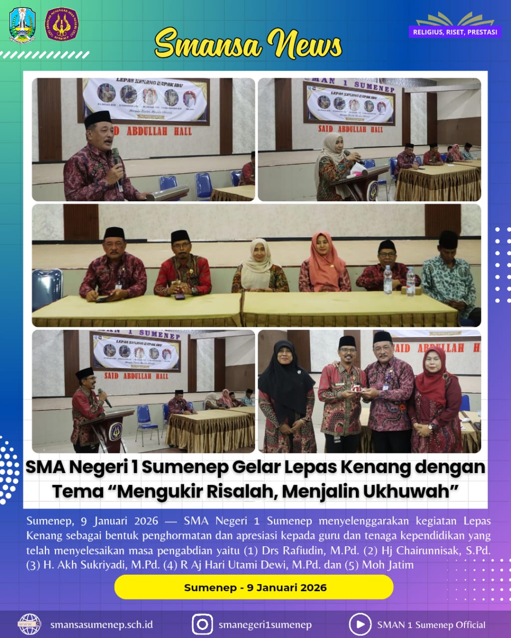 Sumenep, 9 Januari 2026 – SMAN 1 Sumenep menyelenggarakan kegiatan lepas kenang sebagai bentuk penghormatan kepada guru dan tenaga kependidikan yang telah menyelesaikan pengabdian yaitu Drs. Rafiudin, M.Pd., Hj. Chairunnisa’, S.Pd., H. Akh. Syukriyadi, M.Pd., R.Aj Hari Utami Dewi, M.Pd., dan Moh. Jatim.