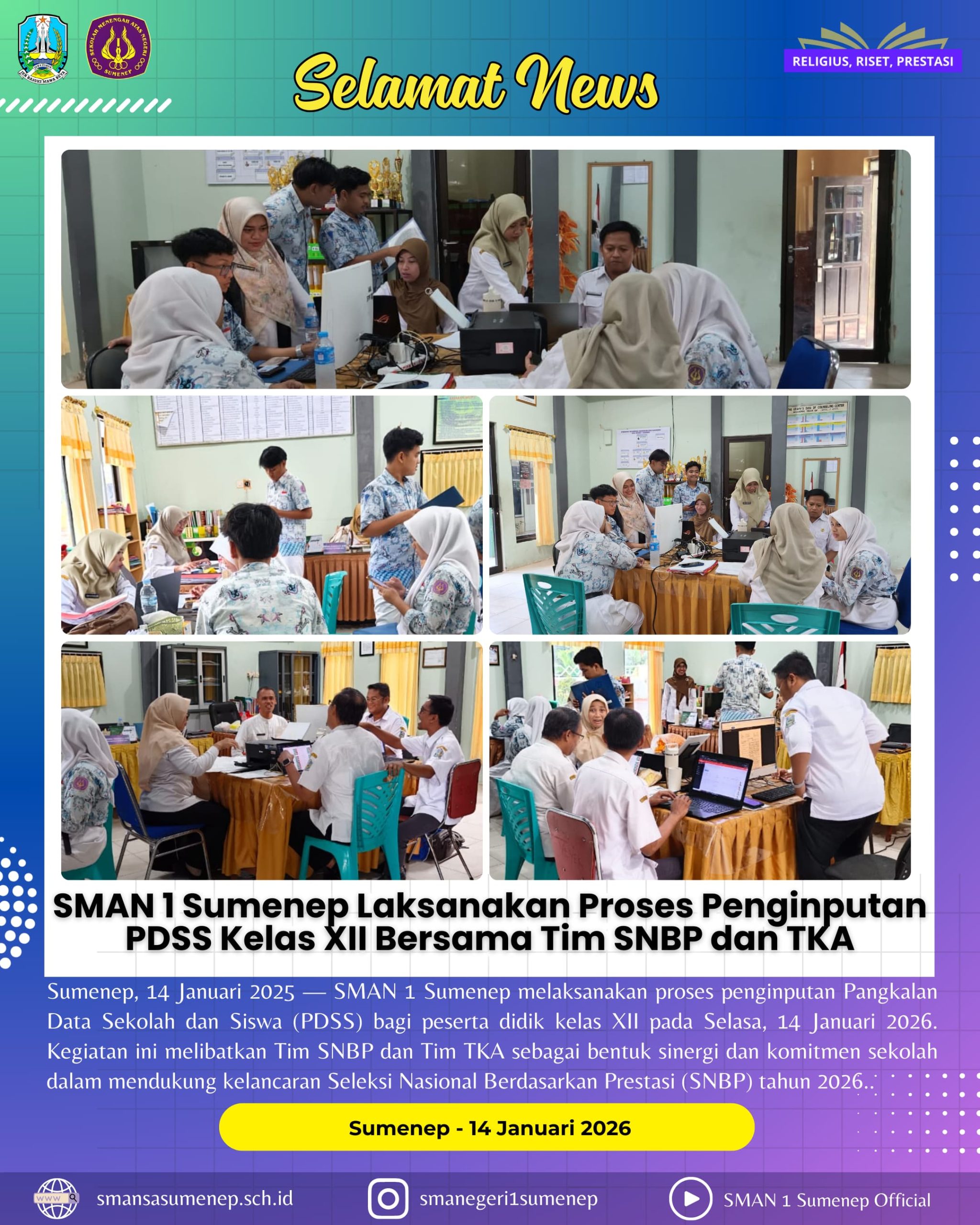 SMAN 1 Sumenep melakukan proses penginputan pangkalan data Sekolah dan Siswa bagi peserta didik kelas XII pada Selasa, 14 Januari 2026. Kegiatan ini melibatkan tim SNBP dan TKA sebagai bentuk komitmen dan sinergi sekolah dalam mendukung kelancaran Seleksi Nasional Berdasarkan Prestasi tahun 2026.