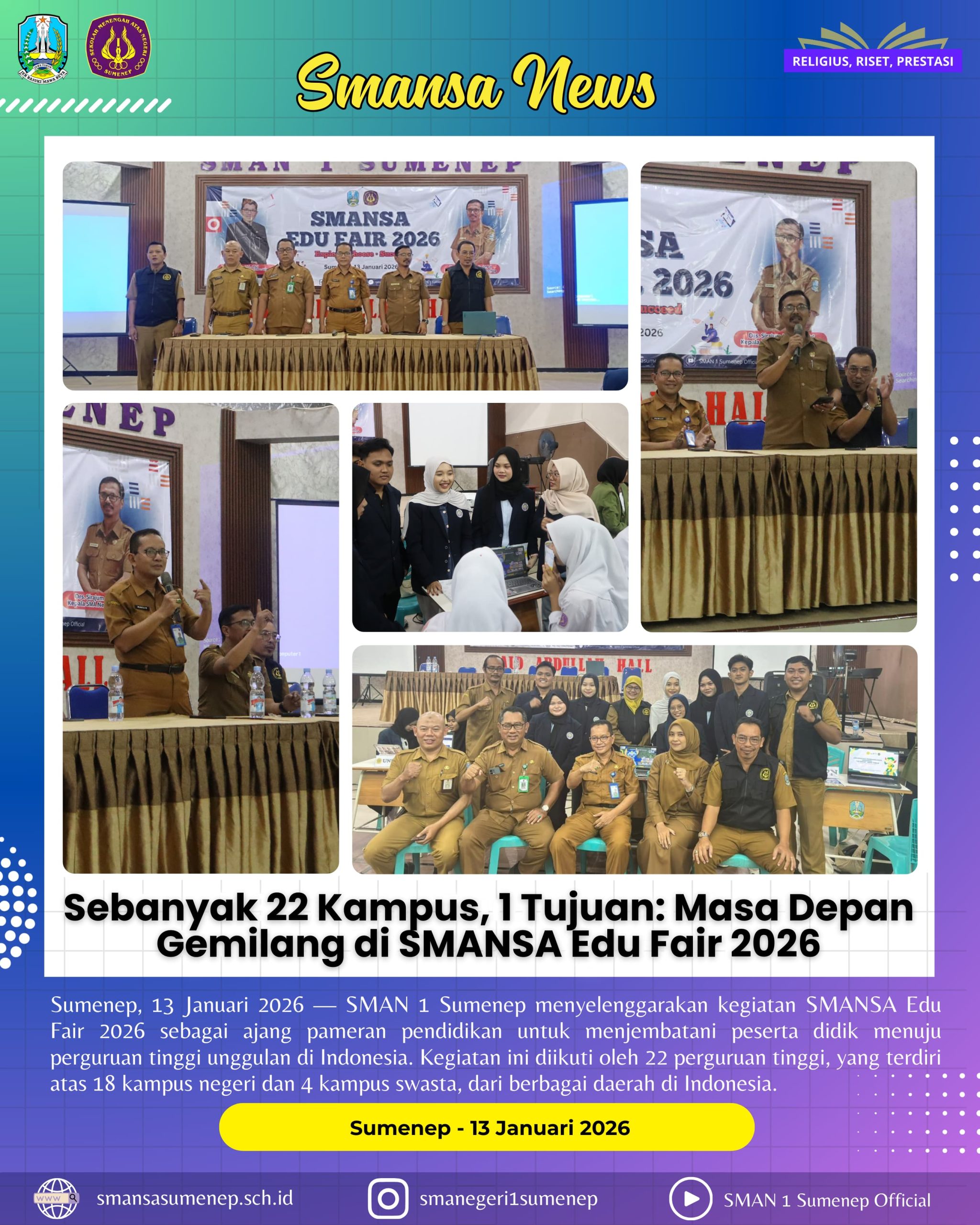 SMAN 1 Sumenep menyelenggarakan kegiatan Smansa Edufair 2026 sebagai ajang pameran pendidikan untuk menjembatani peserta didik menuju Perguruan tinggi unggulan di Indonesia. Kegiatan ini diikut oleh 22 Perguruan tinggi, yang terdiri atas 18 kampus negeri dan 4 kampus swasta dari berbagai daerah di Indonesia.