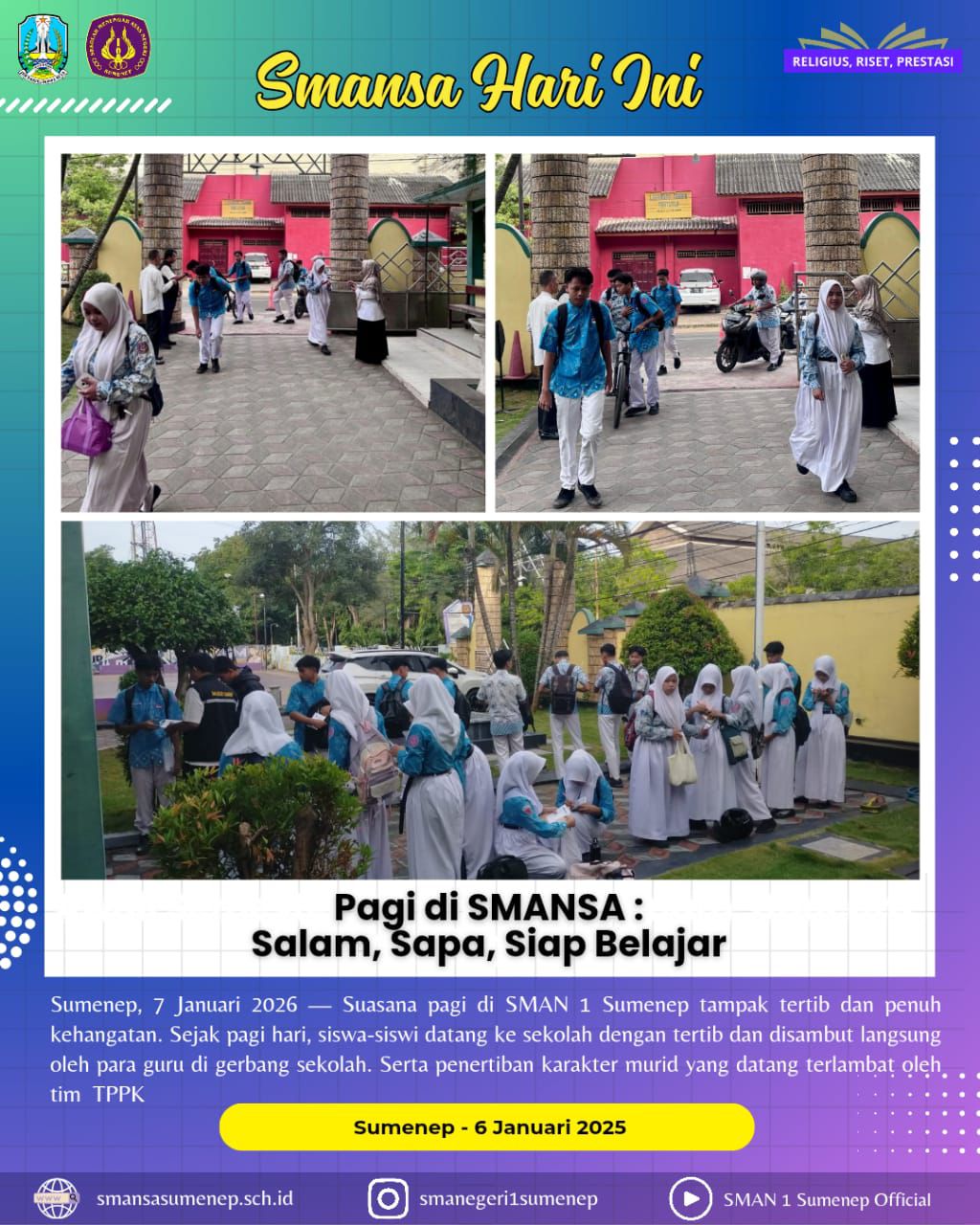 suasana pagi di SMAN 1 Sumenep tampak tertib dan penuh kehangatan. Sejak pagi hari siswa-siswi datang ke sekolah dengan tertib dan disambut langsung oleh guru di gerbang sekolah.