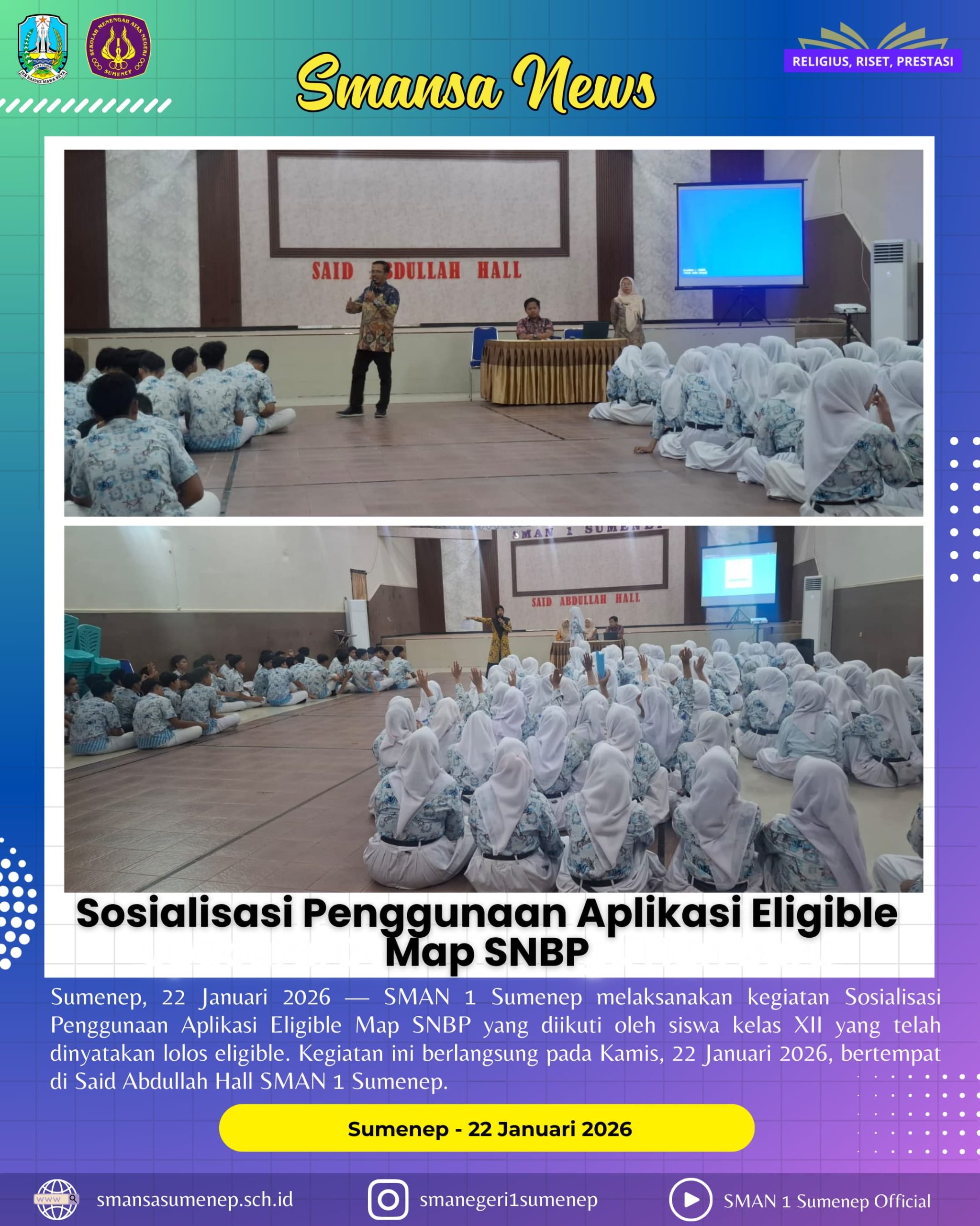 SMAN 1 Sumenep melaksanakan kegiatan sosialisasi penggunaan Aplikasi Eligible. Kegiatan ini berlangsung pada Kamis, 22 Januari 2026 bertempat di Said Abdullah Hall SMAN 1 Sumenep.